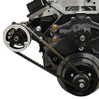 KSE’s new Crate Motor Single Belt Drive Kit was designed for crate motor applications requiring Tandem Pump "front engine installation” (i.e. IMCA A-Mods). This drive kit is specifically designed to work with the new Direct Head Mount Kit (KSC1060) which results in a clean & simple Tandem Pump installation. The Tandem Pump drive kit includes high quality, billet drive components (shown below) and utilizes radius toothed HTD (High Torque Drive) drive pulleys and belt. The updated pump mounting location requires a longer 840mmHTD belt (KSM1058-840) and an updated pulley drive ratio 22/40 (55% crank speed) results in smoother and improved low speed power steering assist.